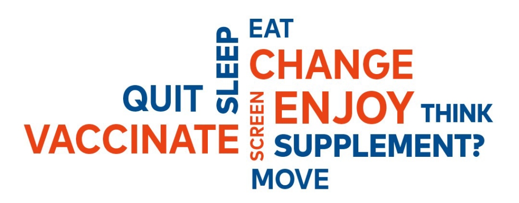 Over the years, those actions on the poster, combined with my further experience as a clinician my readings around health, and my desire for simplicity, evolved to become the 10 chapter titles – Think, Change, Eat, Move, Sleep, Enjoy, Quit (Smoking), Vaccinate, Screen, Supplement? – which I jotted down and thought of often. In doing so, I found myself coming back to those 10 things time and time again, as they always felt important, relevant, and topical no matter what books I read, who I followed on social media, or the conferences I attended. And certainly my daily interactions with patients continued to demonstrate the importance of these fundamentals and the need to find a way to convey them to the public better.