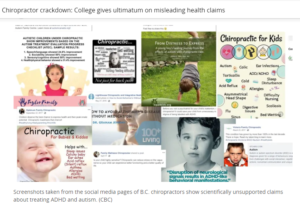 - Chiropractic colleges and Naturopathic colleges clamp down on advertisements that are without evidence or go beyond their scope of practice. (In one promising example, the BC College of chiropractors has given all chiropractors in that province until Nov 1 to remove all scientifically unsupported claims from their websites, social media sites, and printed advertising).